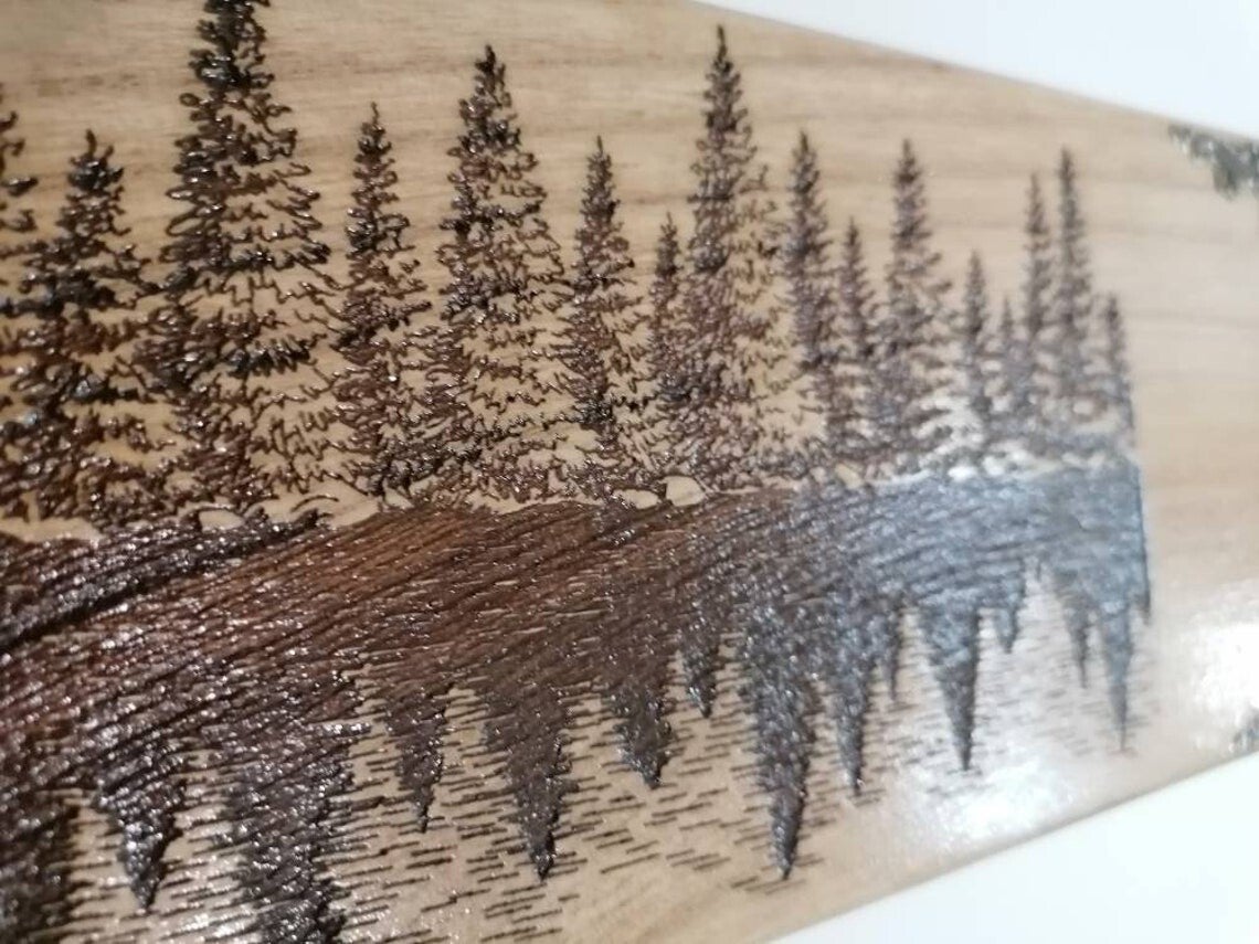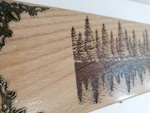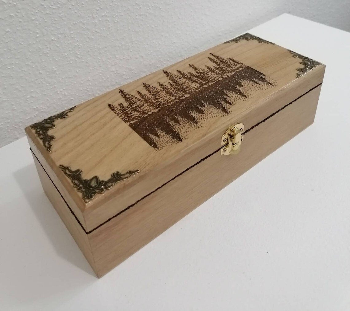 Boîte en bois de hêtre gravée d'une forêt de sapins.