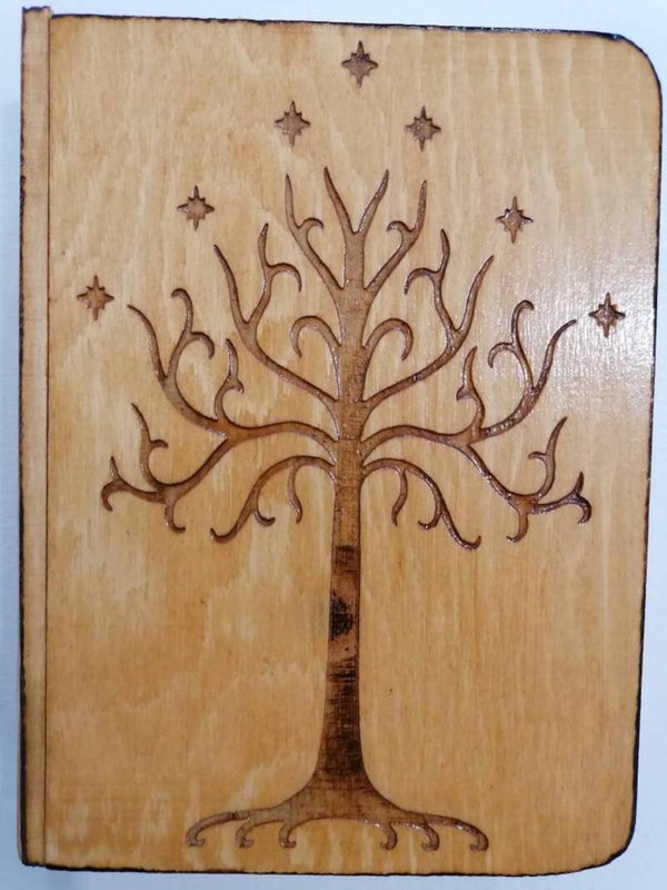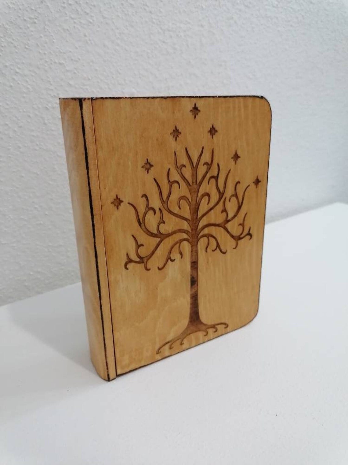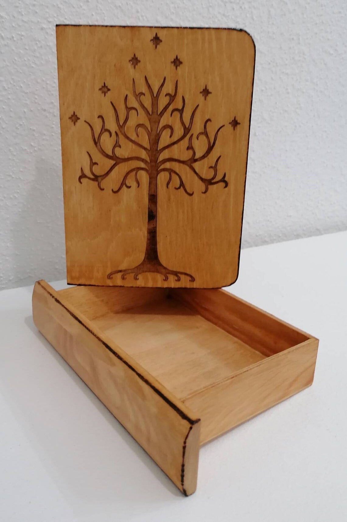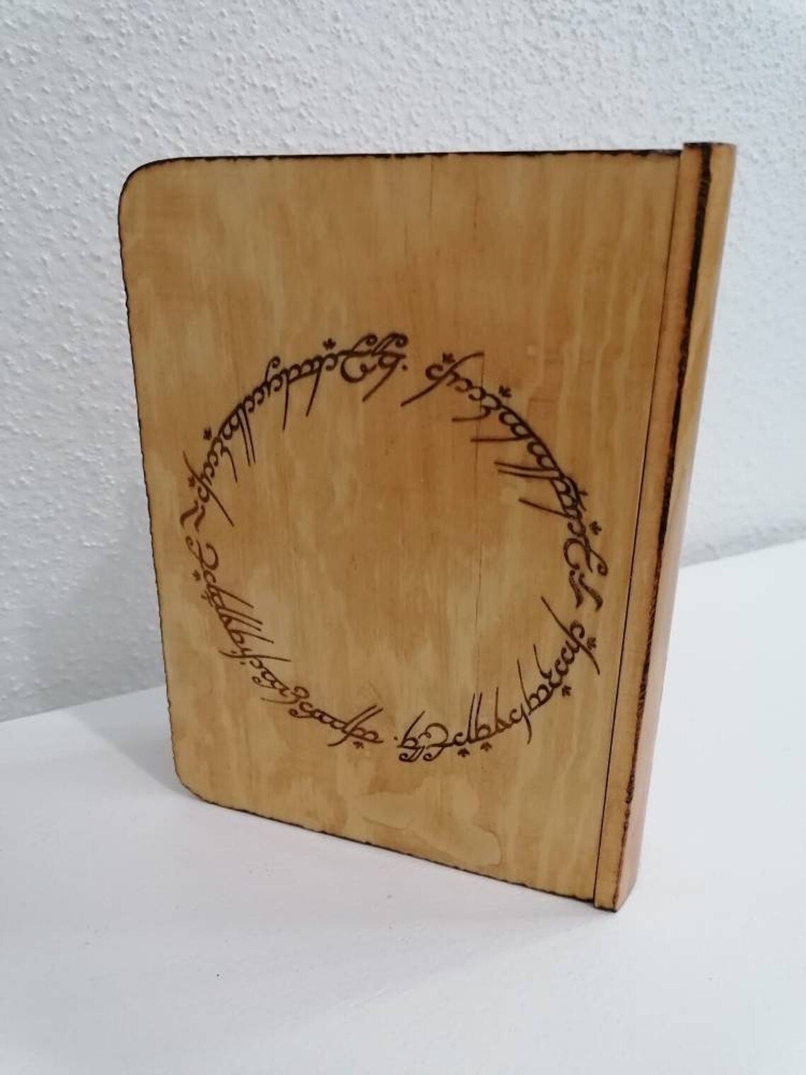 Livre tiroir en bois gravé arbre du Gondor Galathilion et anneau elfique écriture twengar