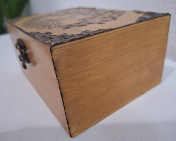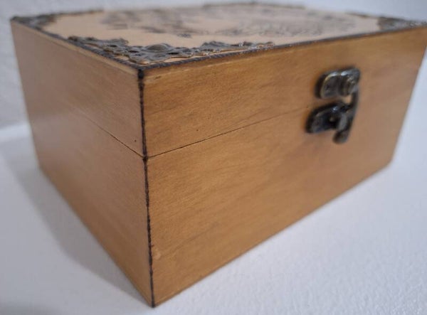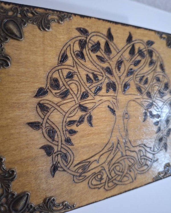 Boite en bois gravée arbre de vie celtique ornée de bronze à 2 compartiments thé bijoux huile essentielle pierres cristaux