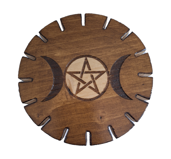 Présentoir en bois gravé symbole triple lune et pentacle, porte bijoux, colliers, pendules, pendentifs radiesthésie