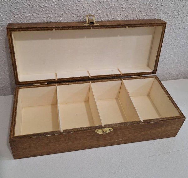 Boîte de rangement rectangulaire en bois 4 compartiments, type boîte à thé.