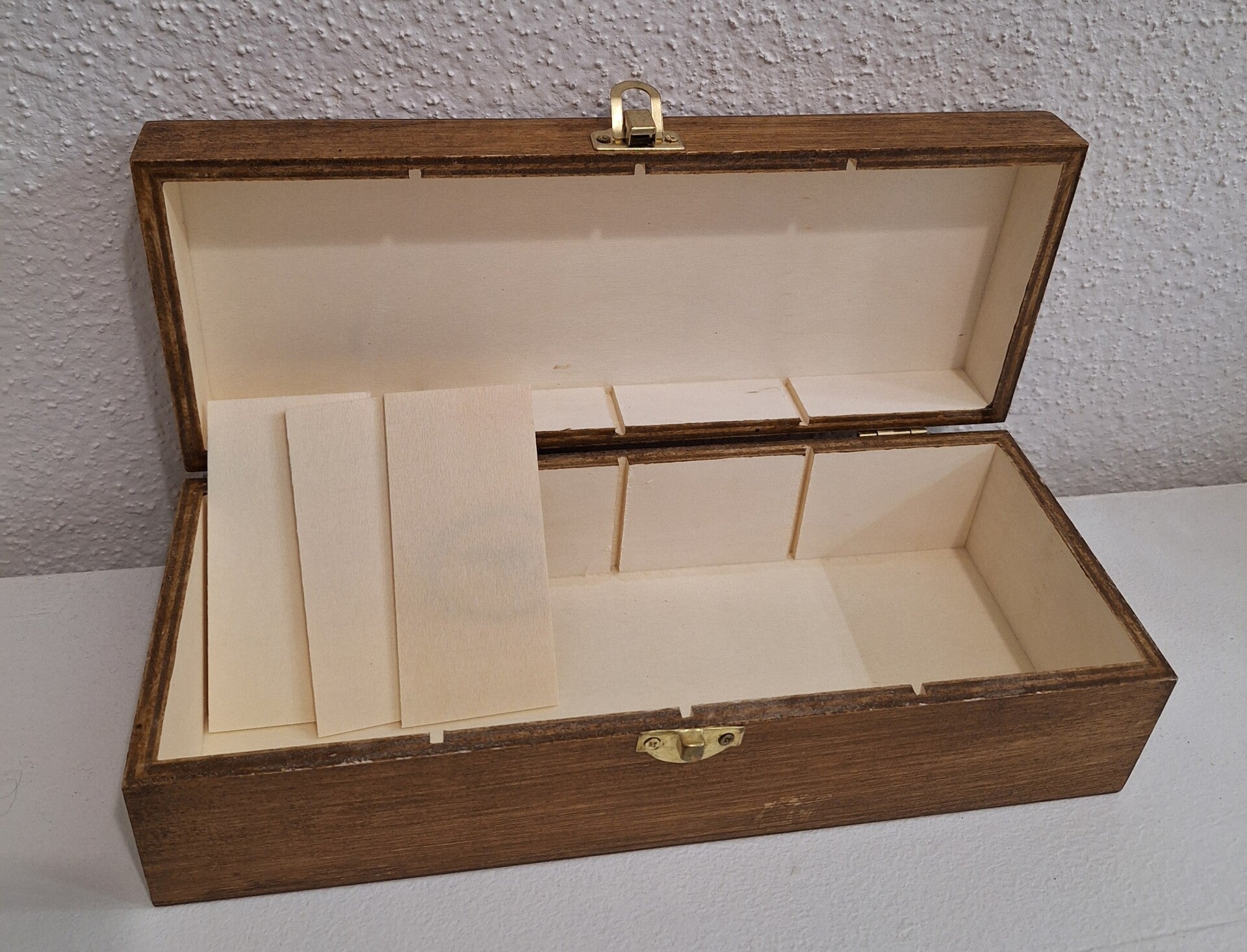 Boîte de rangement en bois composée de 4 compartiments.